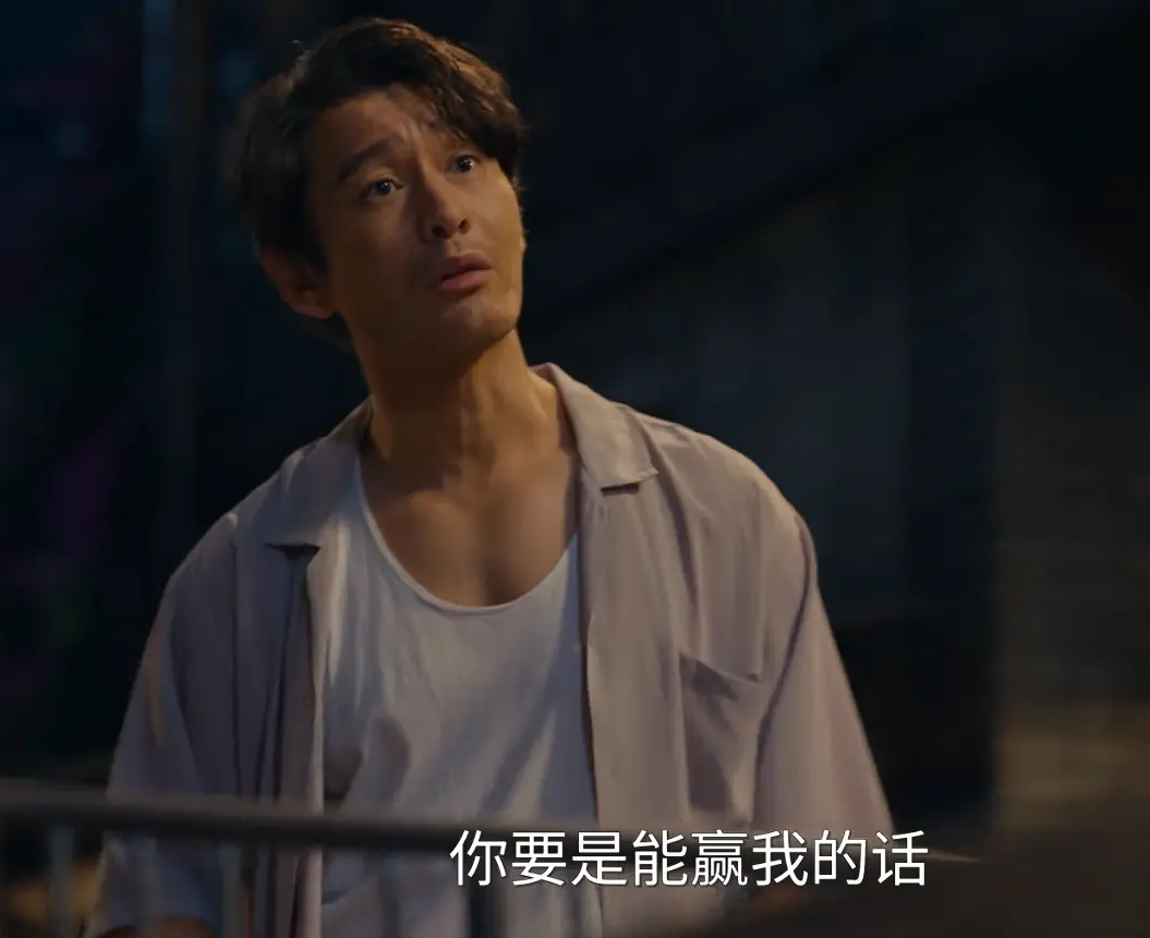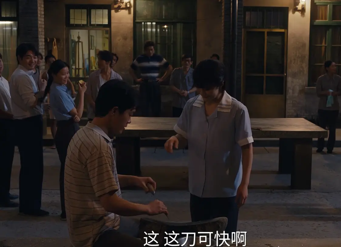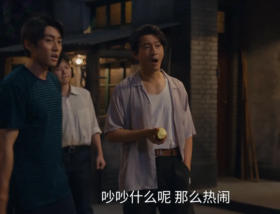 当黄晓明饰演的郑德诚晃悠着走到台前,手里还捏着啃了一半的水果,大咧咧冲小陈喊出“赢了就给你介绍到省体校”的话时,周围邻居都跟着凑趣起哄。