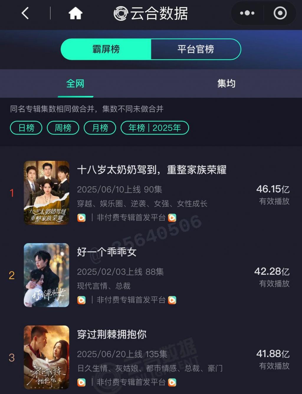 2025 年,“短剧一姐”无疑是手握《十八岁太奶奶驾到,重整家族荣耀》和《夫人她专治不服》两大爆款系列的李柯以。其中《十八岁太奶奶驾到,重整家族荣耀》首部凭借 46 亿的云合有效播放斩获 2025 短剧“剧王”之称,整个系列三部作品总播放量更是超过了 120 亿。