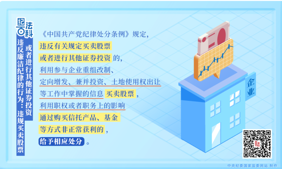 《中国共产党纪律处分条例》第一百零三条第一款第三项规定,违反有关规定买卖股票或者进行其他证券投资的,情节较轻的,给予警告或者严重警告处分;情节较重的,给予撤销党内职务或者留党察看处分;情节严重的,给予开除党籍处分。